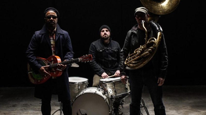 Cela donne un univers assez unique. D’autant plus unique que la composition du groupe est un trio peu courant :Pascal Danaë au chant et à la guitare « dobro » ( guitare au son typé country) qu’il sature volontiers, Baptiste Brondy à la batterie organique, tellurique et Rafgee au sousaphone (ou soubassophone), un instrument de la famille des cuivres apparenté au tuba-contrebasse qu’on retrouve encore dans des fanfares et dont les Louisianais sont friands et au cours de la soirée à la trompette de façon éclatante.