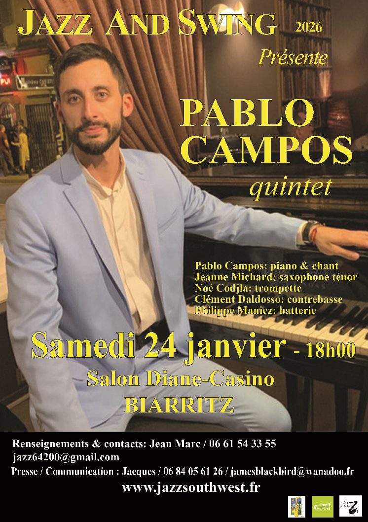 24jan.18 h 00 min- 19 h 30 minPABLO CAMPOS EN CONCERT -BIARRITZJazz and swing Biarritz invite PABLO CAMPOS18 h 00 min - 19 h 30 min LE COLISEE, 11, Avenue SARASATE-64200 BIARRITZ Organisateur: JAZZ and SWING BIARRITZ