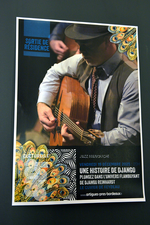 Une histoire de Django Samedi 14 Février 2026 – Targon 19h30 : 1ère partie avec les classes jazz de Monségur 21h : Une histoire de Django Buvette et petite restauration sur place Gratuit pour les